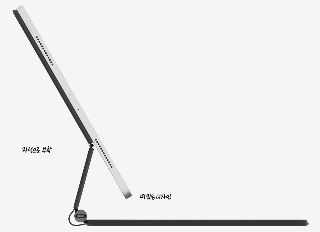 다르게, 아이패드 프로4세대가 자석에 붙은 체 공중에 떠있는 디자인이다.