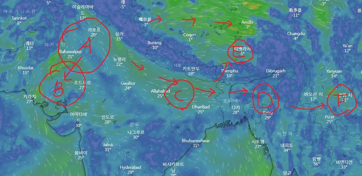 히말라야 산맥은 높고 춥기 때문에 바로는 못 넘고,