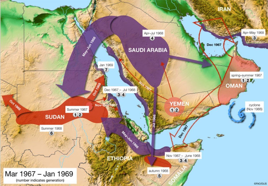 북동 아프리카부터 인도 펀잡 지방까지 대략 6500억마리 수준으로 불어나 있는 상태라고 한다.