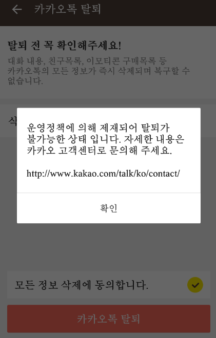 카톡 어플 내부에선 탈퇴를 진행할 수 없습니다.