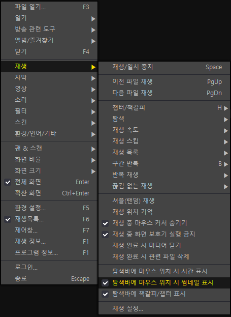 "재생" > "탐색바에 마우스 위치시 썸네일 표시" 클릭!