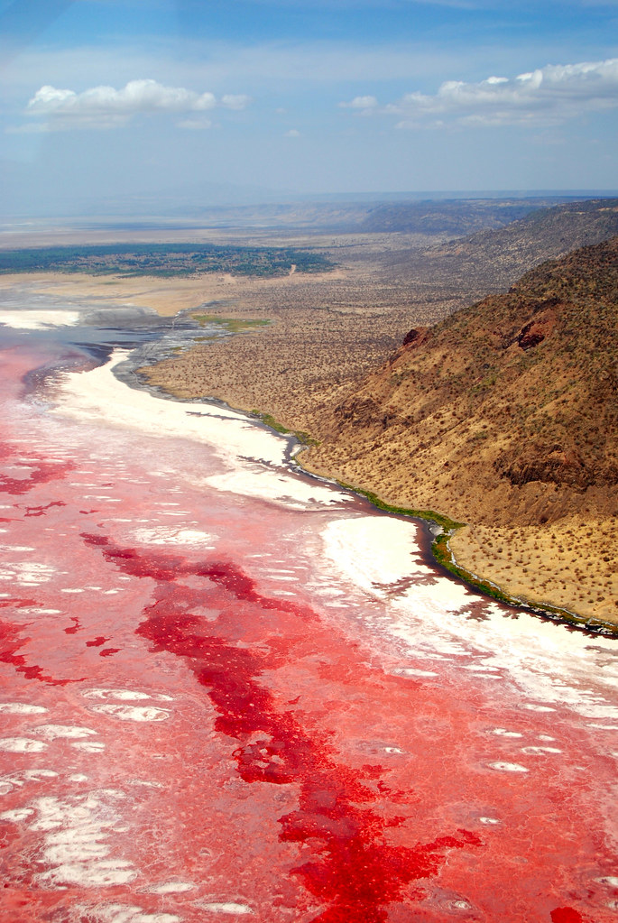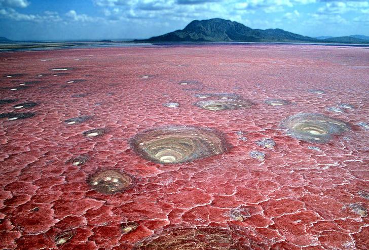 그 미생물들이 호수를 붉은색으로 물들였다.