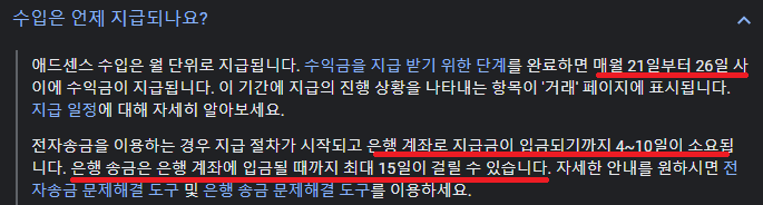 21~26일 사이 구글 애드센스 수익금이 등록한 계좌로 입금됩니다.