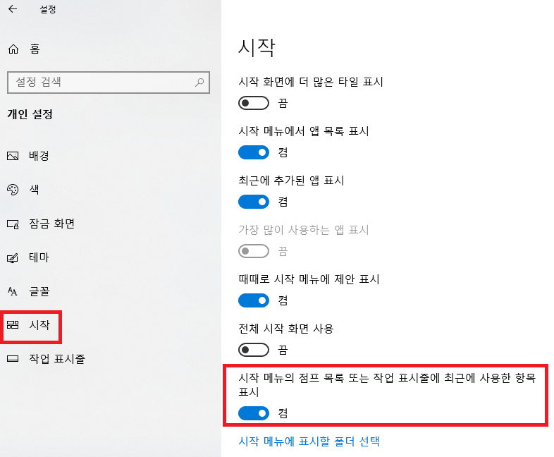 "시작 메뉴의 점프 목록 또는 작업 표시줄에 최근에 사용한 항목 표시" 를 클릭해서