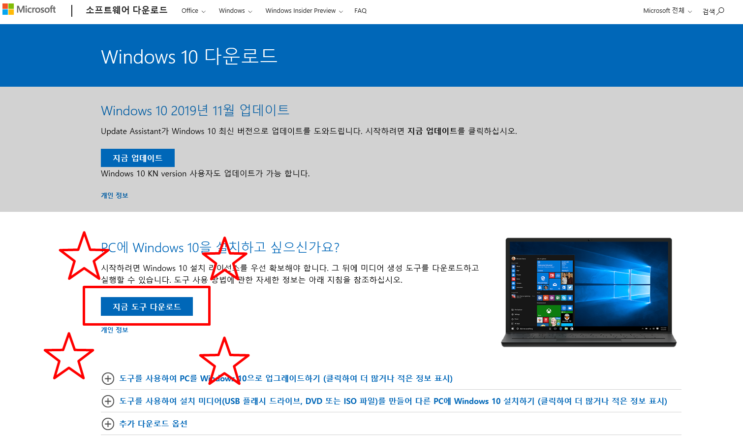 옛날방식마냥 윈도우10 ISO파일을 다운받을 수도 있지만.