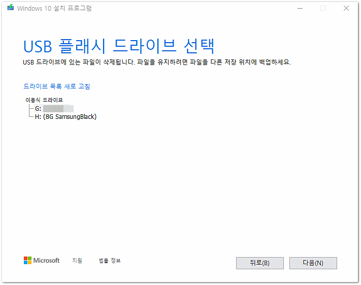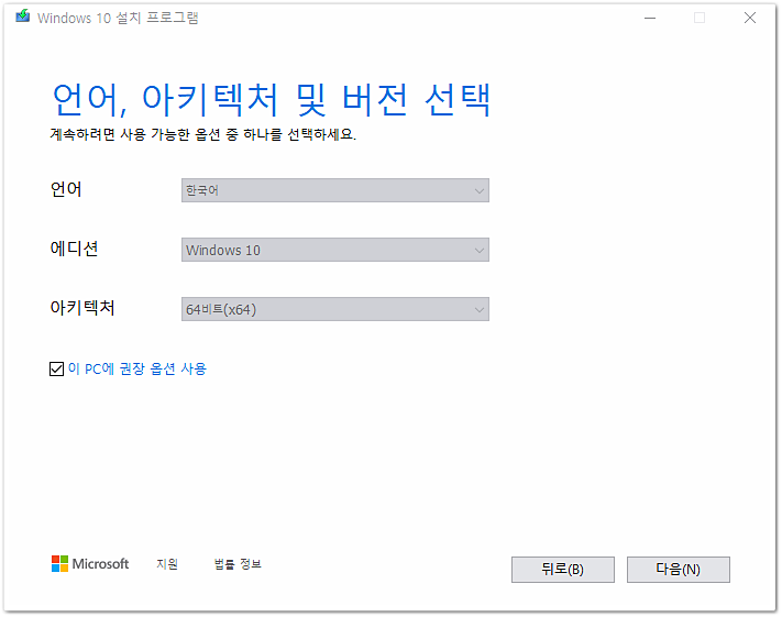 즉, 윈도우10 설치 USB를 만들고 있는 컴퓨터를 기준으로 옵션이 설정된다.