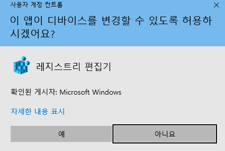 위 사진처럼 레지스트리 편집기를 열기위한 "regedit" 을 입력후 확인을 눌러준다.
