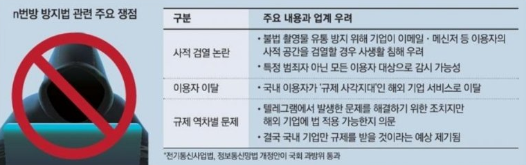 - 인터넷 사업자가 불법 촬영물 삭제 및 차단을 의무적으로 수행해야 하며 안지키면 3년 이하 징역이나 1억원 이하 벌금형 (업계에서 감청 논란이 있으며 20일 본회의에서 결정)