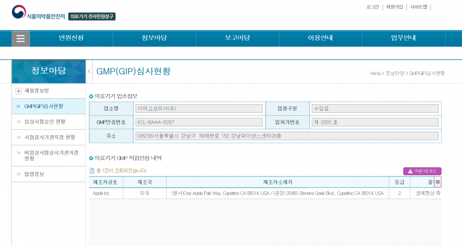위 식품의약품안전처 GMP(GIP)심사현황 링크에서