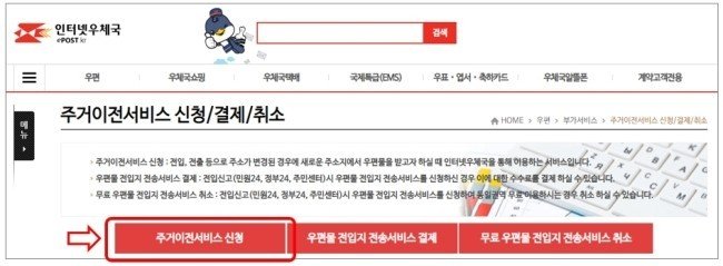 우체국에서 제공하는 서비스. 주거이전서비스 신청을 이용하면 이사한 주소로 우편물 주소를 한번에 다 옮길 수 있다.