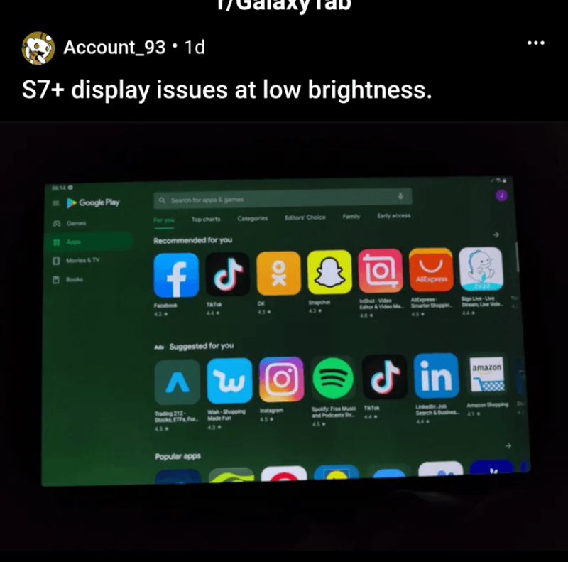 위 사진은은 갤럭시탭S7이며 어두운 공간에서 어두운 화면이 나오는 영상을 시청시 갤럭시탭S7 디스플레이 좌측에 빨간색, 파란색이 보인다. 문제 디스플레이의 갤럭시탭S7을 삼성전자 서비스센터에서는 정상이라 판정받은 상황이며, 기기 유저는 유튜버와 삼성멤버스, 삼성 서비스센터 이메일 상담에 문의한 상황이라고 한다. 하지만 해당 현상은 LCD의 고질병. LCD에서 정말 자주 나오는 결함현상. 소프트웨어로 해결하는게 아닌 화면 일부 영역에서 발생함으로 교품이나 환불말곤 답이없다.