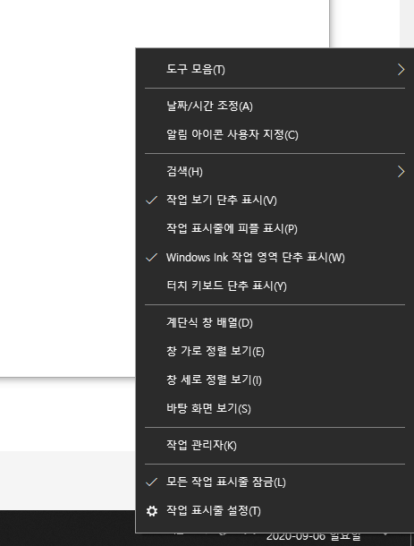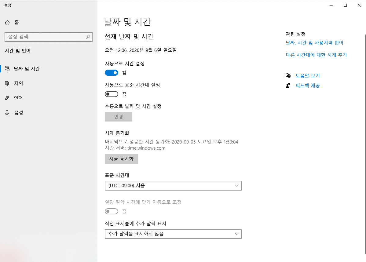 그냥 윈도우10 작업표시줄 시계에 마우스를 가져다 대고 오른쪽 클릭하면 위와 같은 창이 하나 나온다