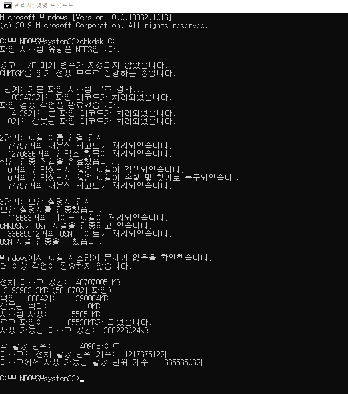 이렇게 입력하고 엔터 눌러주면 점검이 시작된다.