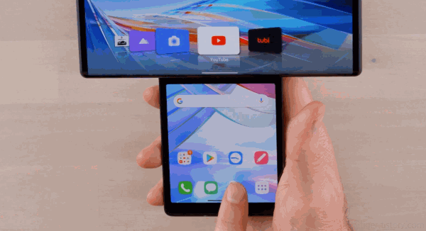LG윙의 스위블 모드를 통해 세컨드 스크린을 한손으로 쥐고 메인 디스플레이로 영상을 감상하거나