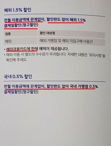 그리고 국내에선 0.5% 할인이 무실적, 무제한 한도로 제공됩니다.