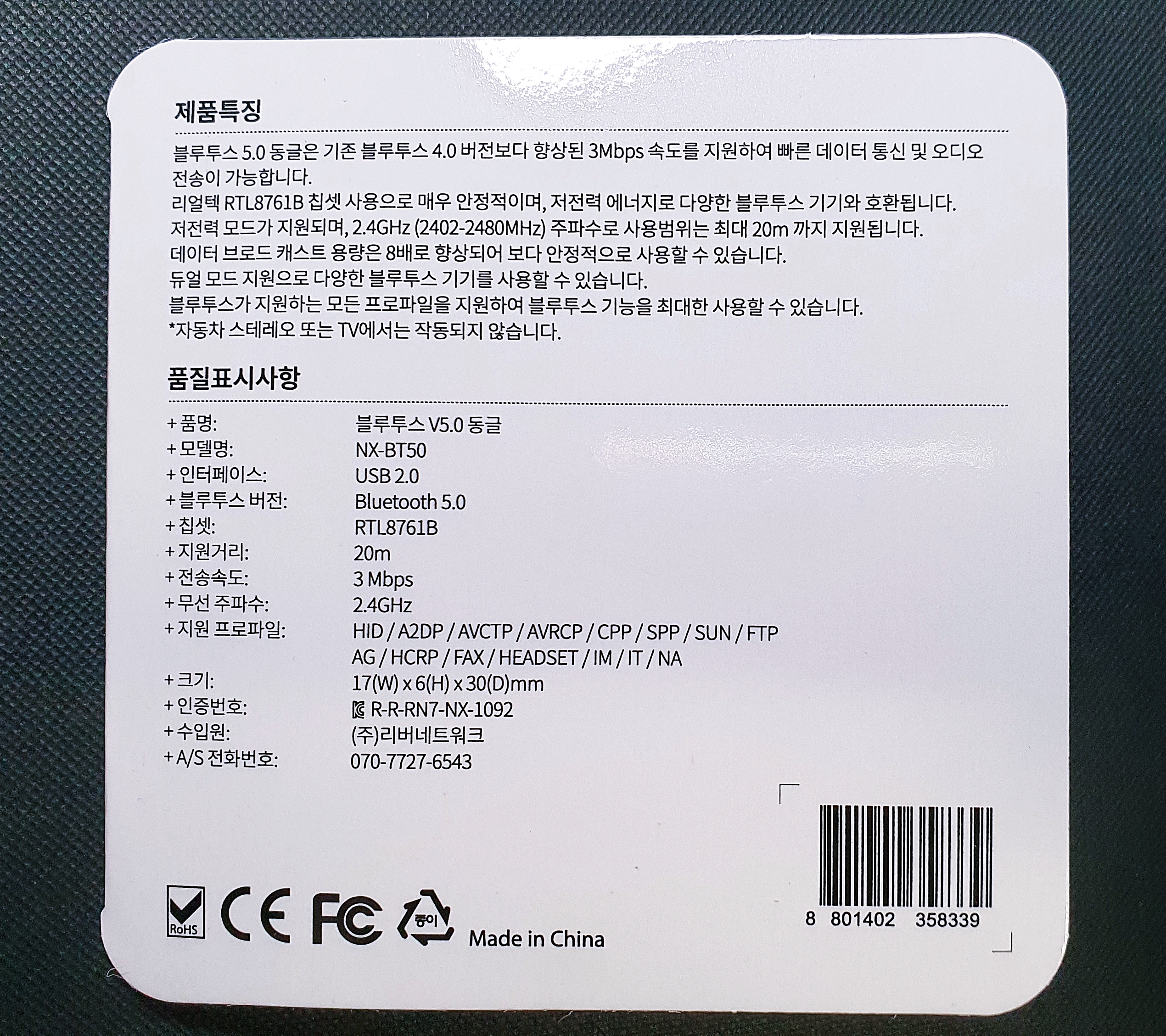 블루투스 5.0을 지원한다고 USB에도 적혀있습니다.
