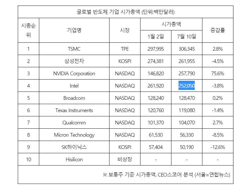 시가총액에서 인텔은 4위까지 밀려나고