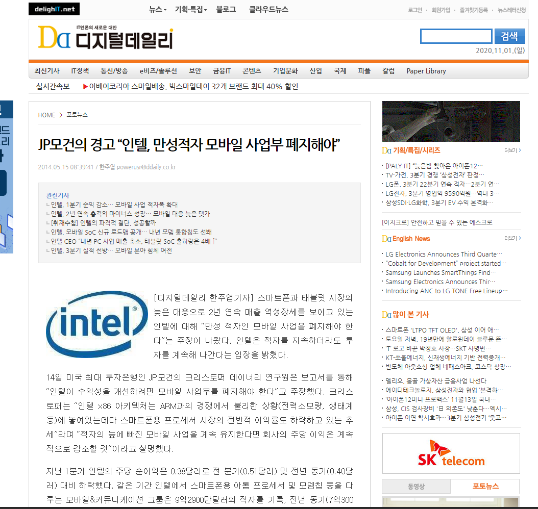 2014년부터 2020년까지 인텔은 모바일 사업에서 적자를 어마어마하게 본다.