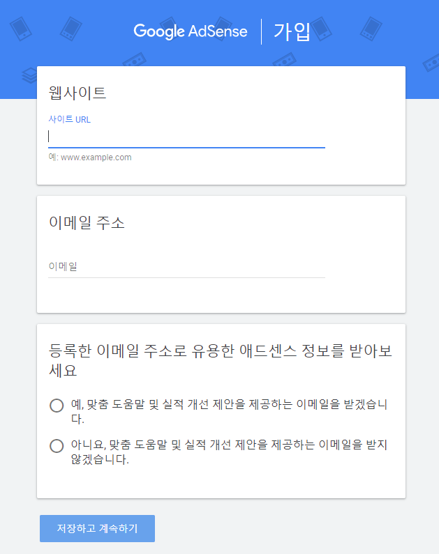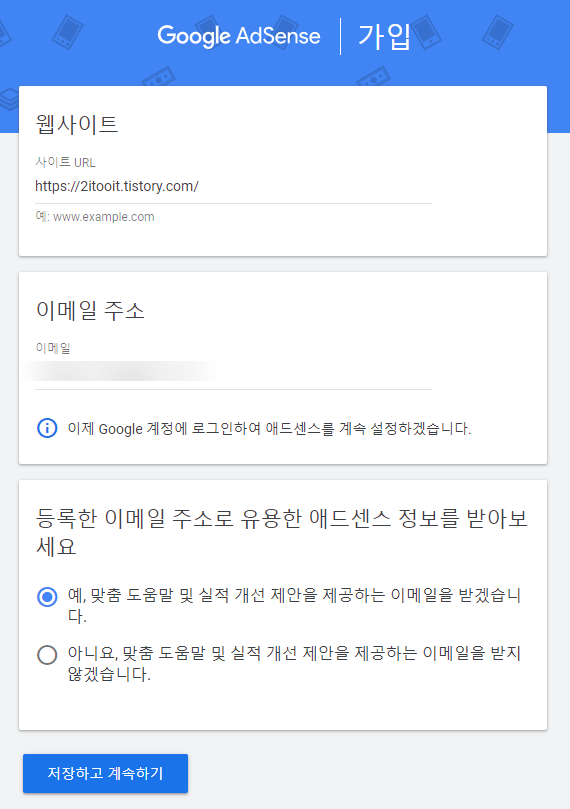 그리고 추후 애드센스에서 보내주는 정보나 이메일을 받을 구글계정이메일을 입력해줍니다.