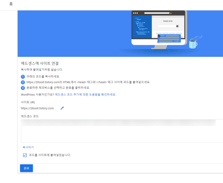 돌아와서 코드를 사이트에 붙여넣었습니다 체크!!!