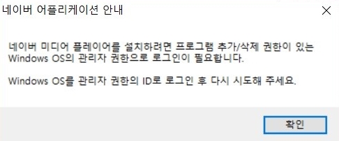 네이버 미디어 플레이어를 설치하려면 프로그램 추가/삭제 권한이 있는 Windows OS의 관리자 권한으로 로그인이 필요합니다. Windows OS를 관리자 권한의 ID로 로그인 후 다시 시도해 주세요.
