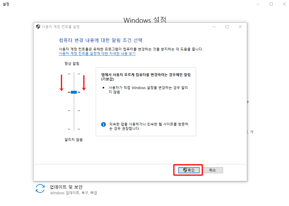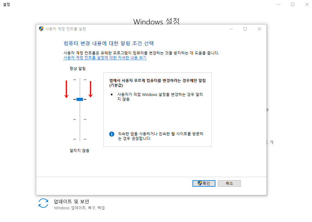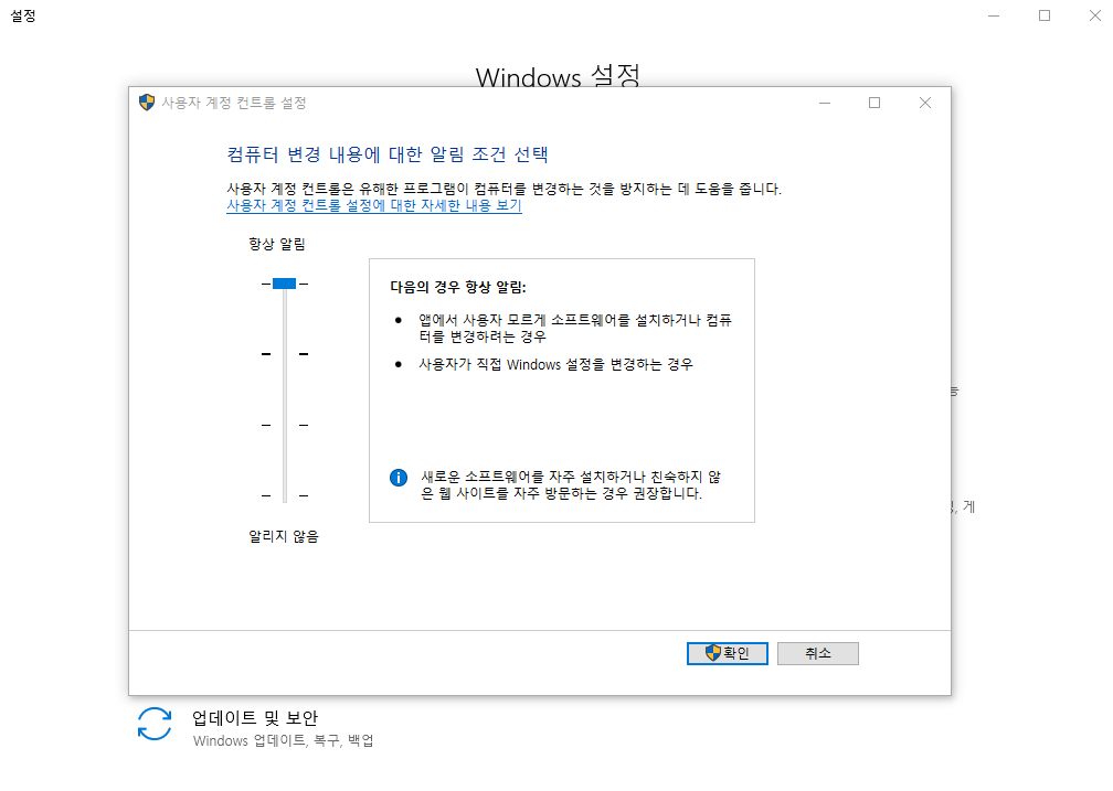 사용자가 ㅇㅋ하고 프로그램 설치를 눌렀음에도 다시한번 확인차 Windows 알림창이 뜨게 설정된것을 낮추는 것이다.
