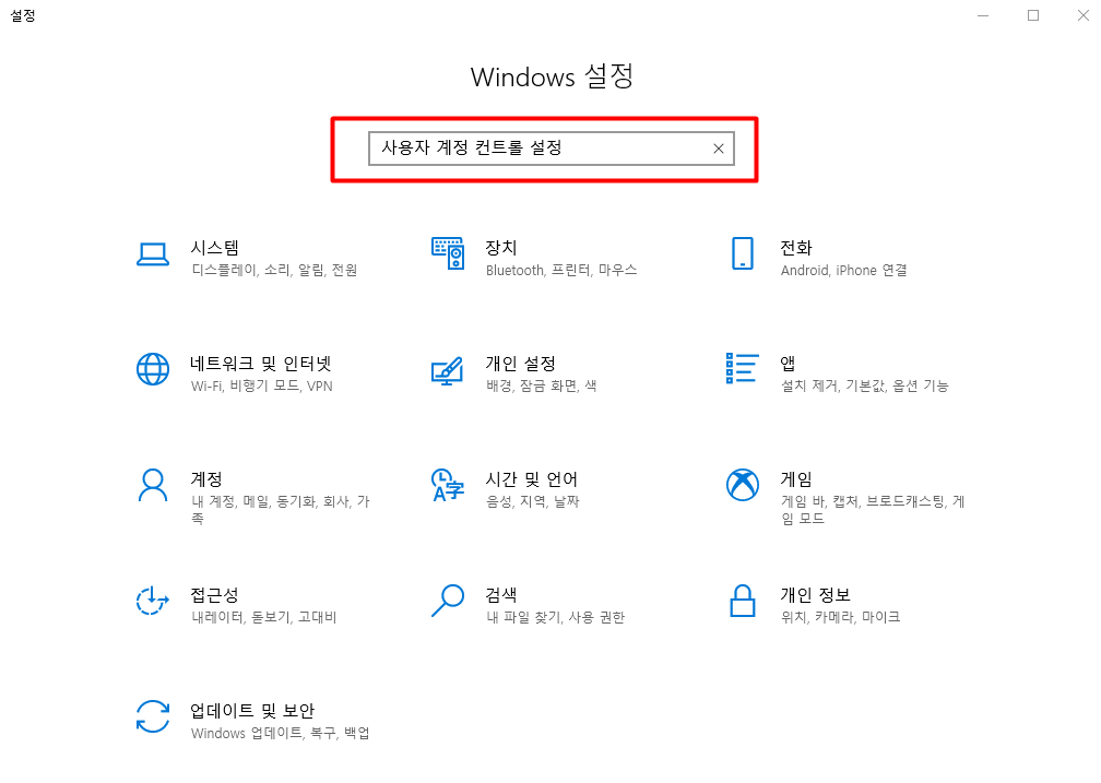 윗쪽 빨간 검색 창에 "사용자 계정 컨트롤 설정"이라고 치고 엔터를 눌러준다.