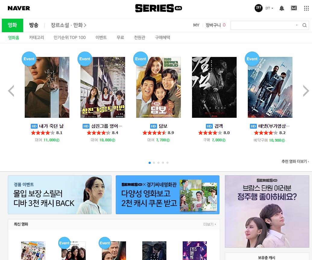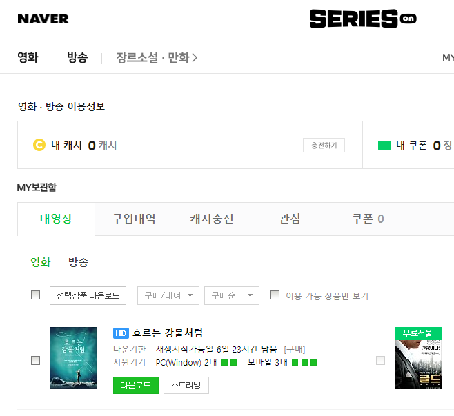 보통 이런 경로로 네이버 시리즈온에서 영화를 다운로드를 실행했고