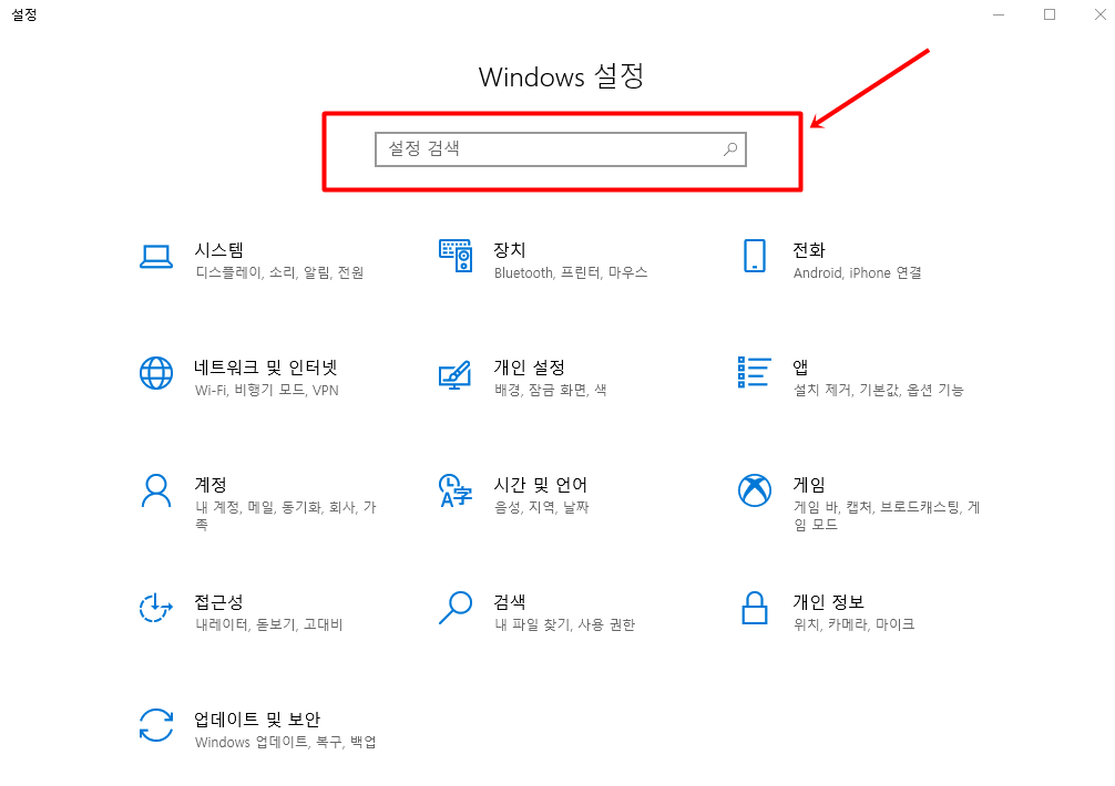 윈도우 키를 누르면 위와 같은 창이 나오고 상단에 톱니바퀴를 눌러 "Windows 설정" 창을 띄워준다.