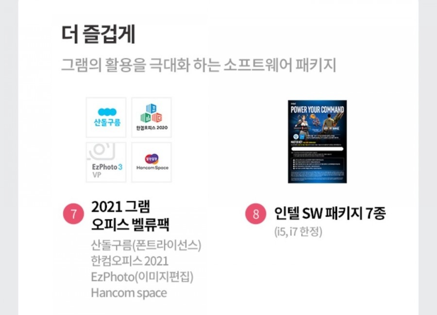 그리고 LG 그램 2021 사전예약 혜택인데 i5 나 i7 모델 구매자만 인텔 소프트웨어 패키지 7종을 준다고 한다.