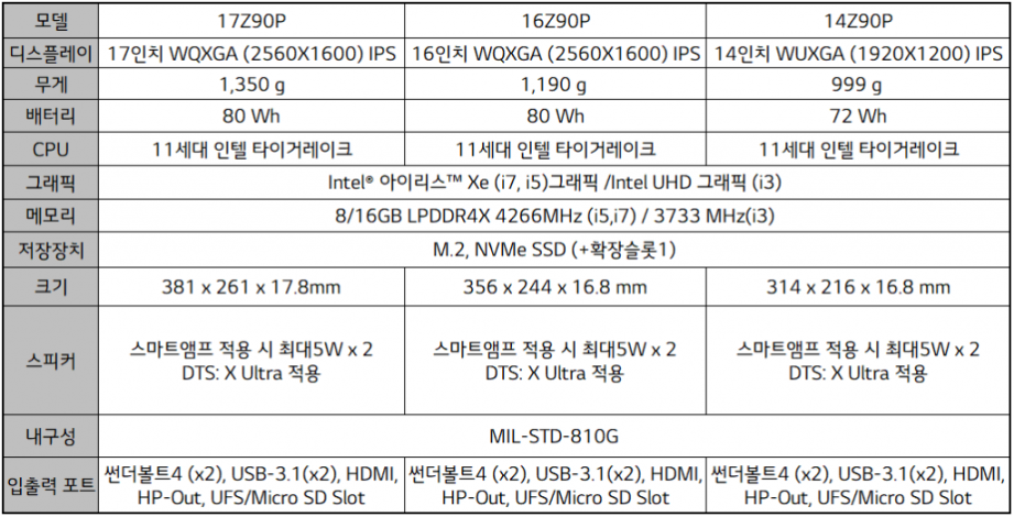 맨 아래에 LG그램 2021 14인치, 16인치, 17인치 별 스펙을 표로 정리해놓았으니 확인하면 더욱 편리하니 참고하시면 좋을듯합니다.(무게, 배터리 크기, CPU, 메모리, 크기 등등)