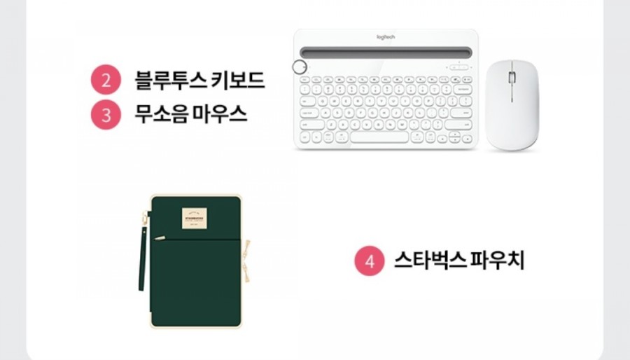 블루투스 키보드, 무소음 마우스, 스타벅스 파우치다.