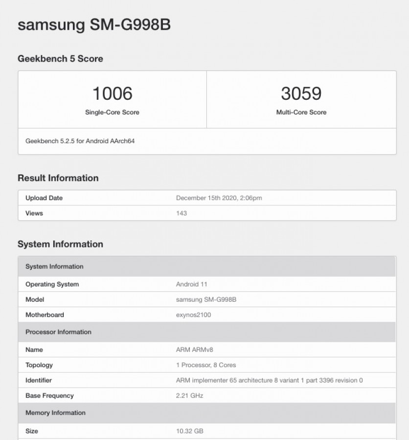 엑시노스2100, 12기가 램, 안드로이드 11을 탑재한 것으로