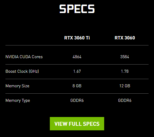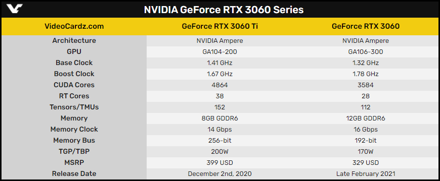 RTX3060Ti(GA104-200)에 사용된 GA104와는 다른 SKU인 GA106 칩셋을 탑재한게 차이점이었으며