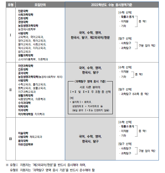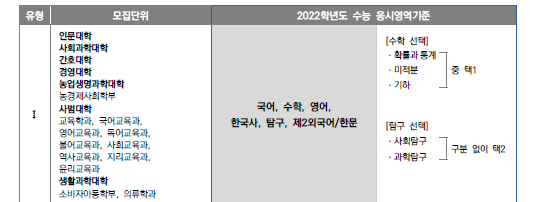 서울대학교에서 공개한 2022수능 선택과목 기준에 따르면