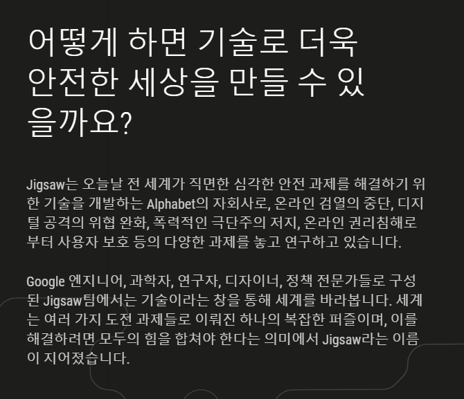 2010년 설립된 직소 회사는 위에서 보듯 인터넷 자경단의 역할을 목표하고 있습니다.