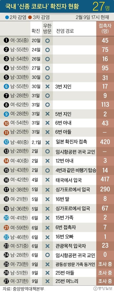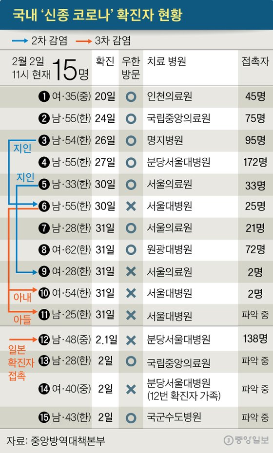 2월2일 현재 각 확진자 별 입원 위치와 접촉자는 위와 같습니다.
