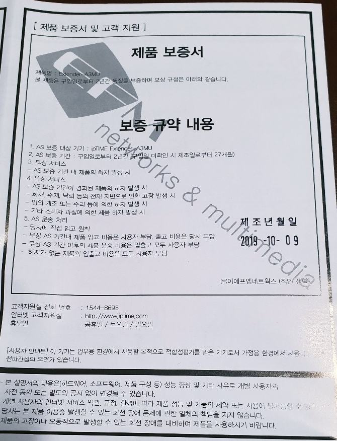 ipTIME Extender-A3MU 설명서에 함께 들어있는 제품 보증서