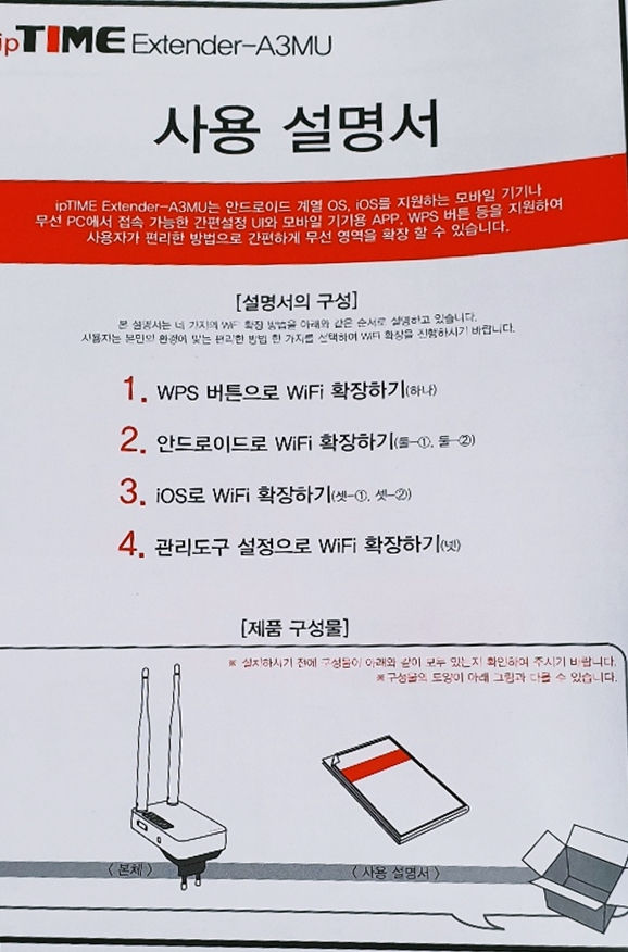 메시 와이파이 확장기 ipTIME Extender-A3MU 박스 안엔 이렇게 되어있다. (설명서와 본체)