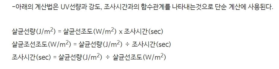 조사시간(sec) = UV 선량(J/cm(2)) / UV 강도 (W/cm(2))