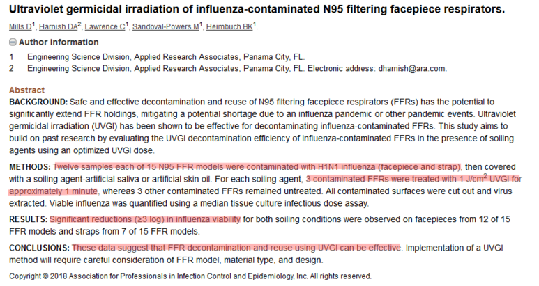 Ultraviolet germicidal irradiation of influenza-contaminated N95 filtering facepiece respirators. 1Engineering Science Division, Applied Research Associates, Panama City, FL.2Engineering Science Division, Applied Research Associates, Panama City, FL. Elect