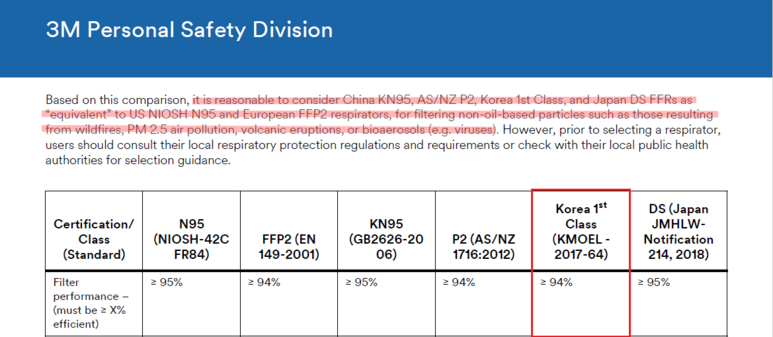 한국 마스크 인증등급인 KF 94에 대해 따로 언급하진 않아서 정확하겐 모르겠다.